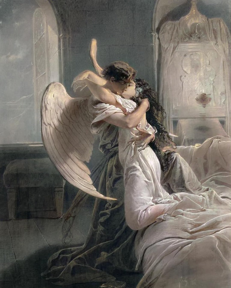 Her sisters yearned to know the fate of their sister, so Eros allowed the West Zephyr Winds to carry them to the palace just has they had Psyche. Upon arrival, they were instantly green with envy. Instead of being overjoyed for their sister and her splendor, they sowed seeds of doubt; surely her husband was the beast of which the oracle warned, that he would one night devour her and her unborn child, that she must kill him before he kills her. Instead of pleasantries, they left her with a dagger.